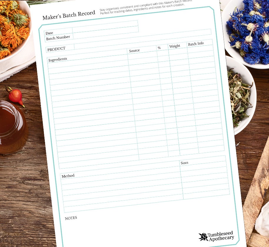 This Maker's Batch Record in A4 printable is a valuable tool designed to help balm-makers, herbalists and small-batch creators keep their process organised and compliant. With this one-page sheet, you can easily track batch numbers, ingredients, sources, and notes, ensuring consistency in your creations. It's ink-friendly, clear, and perfect for home printers. Pair it with the Maker's Notes page for a complete maker's toolkit.